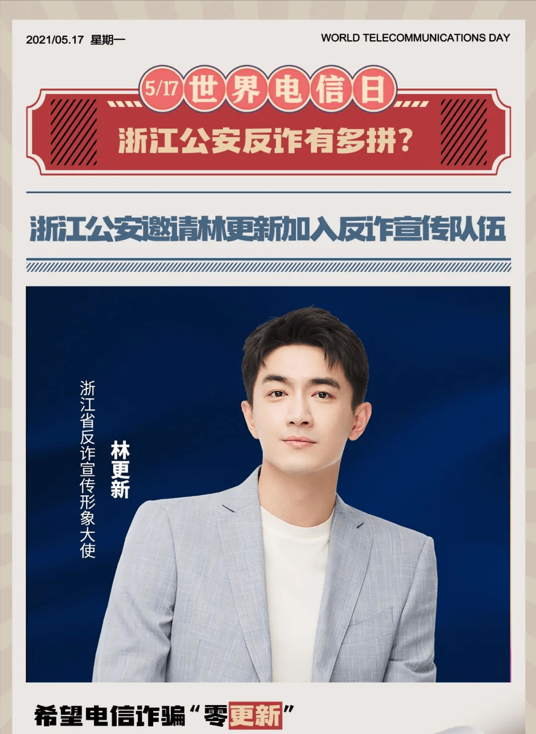2021年5月17日世界电信和信息社会日当天,浙江省暨金华市防范电信网络诈骗、保护“三电”设施启动仪式上,林更新正式受聘为浙江省反诈宣传形象大使。