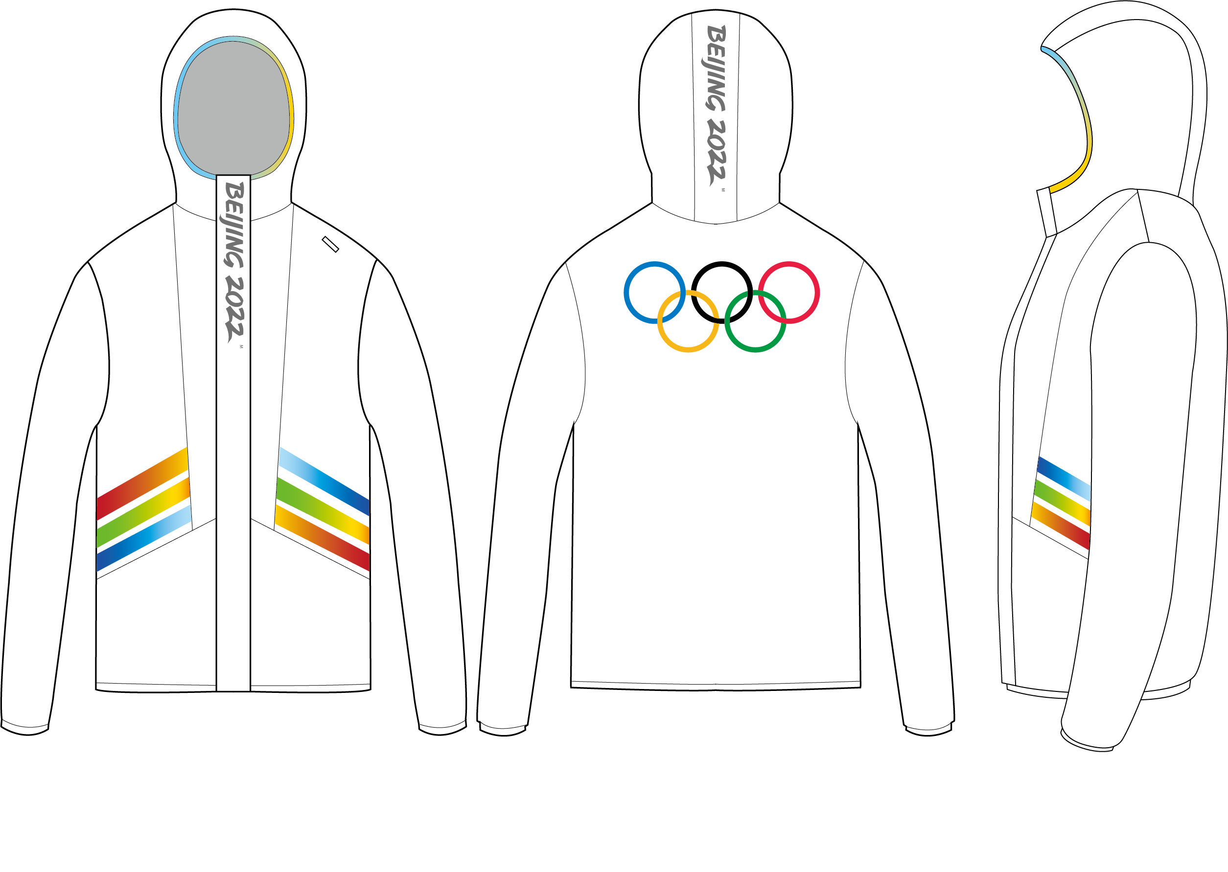 郭昱成介绍,该套工作服设计围绕“北京与奥运”,服装色彩采用大面积的瑞雪白,以印有“BEIJING2022”冬奥文字图形的前门襟为视觉中轴线,左右两侧对称呈现的三条倾斜式彩虹条纹,表现出中国设计特有的端方正直之美。