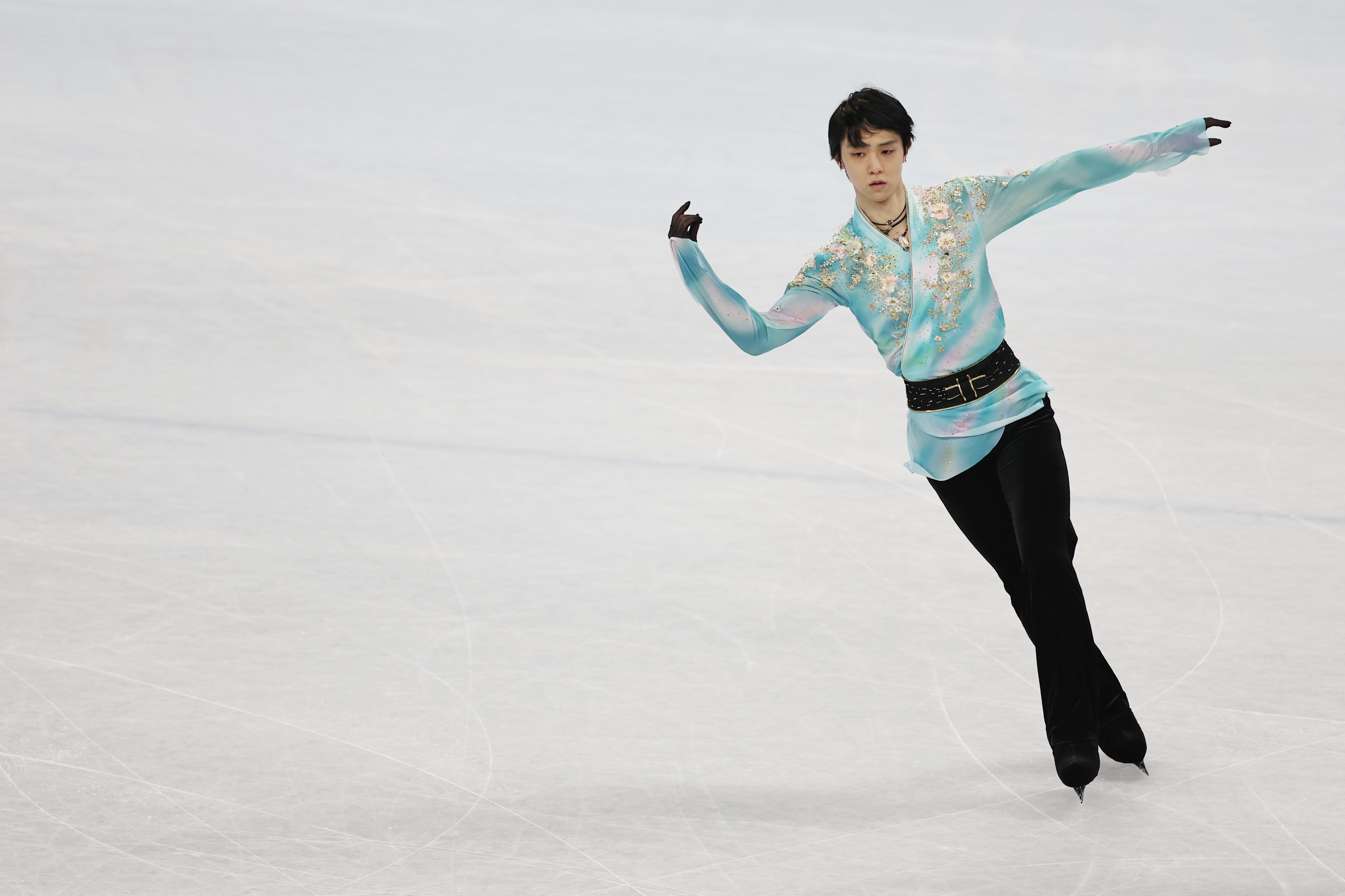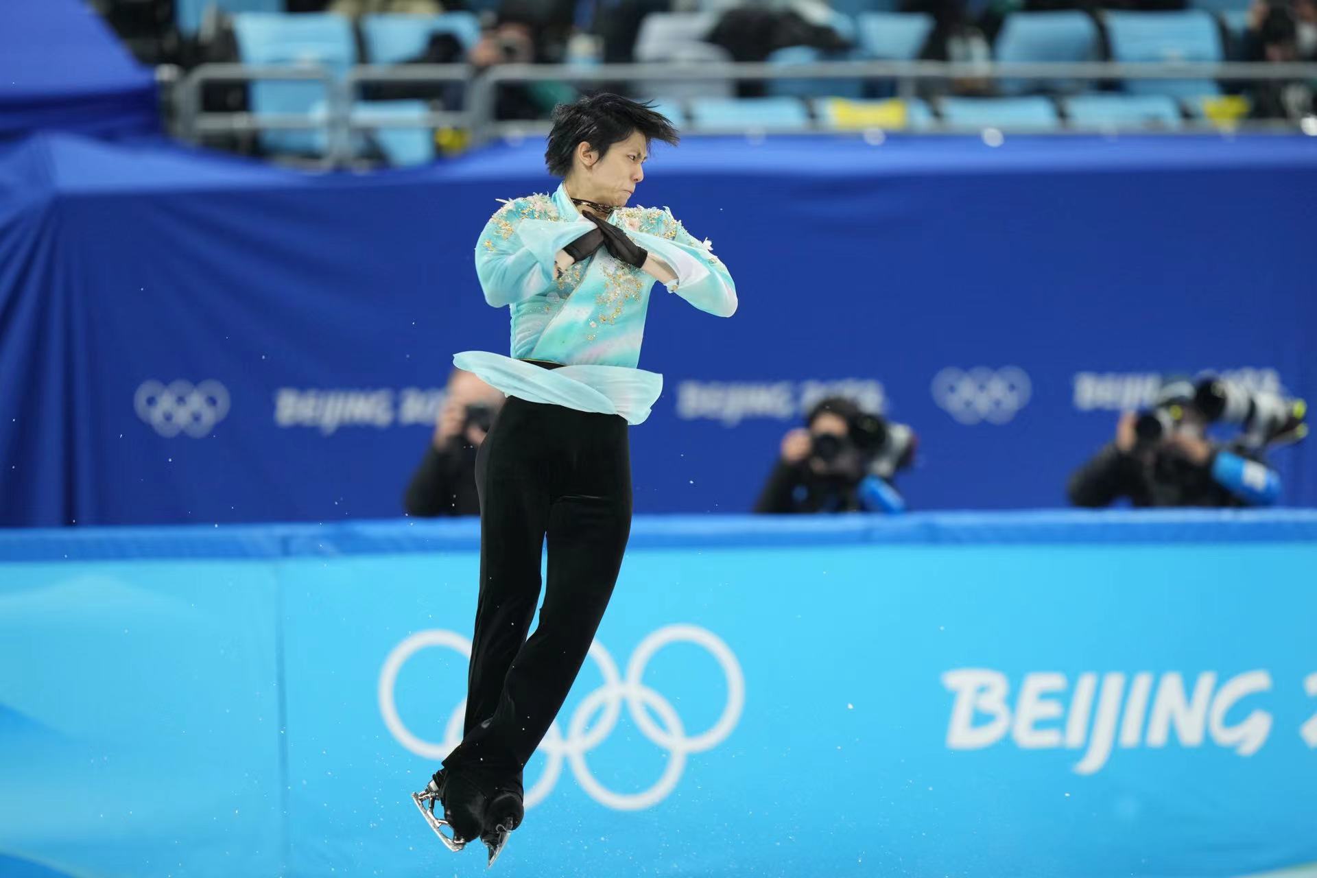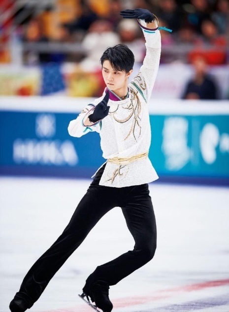 身着青白底色缀金色亮片刺绣上衣,羽生结弦决赛中的动作依然翩若惊鸿,宛若游龙。
