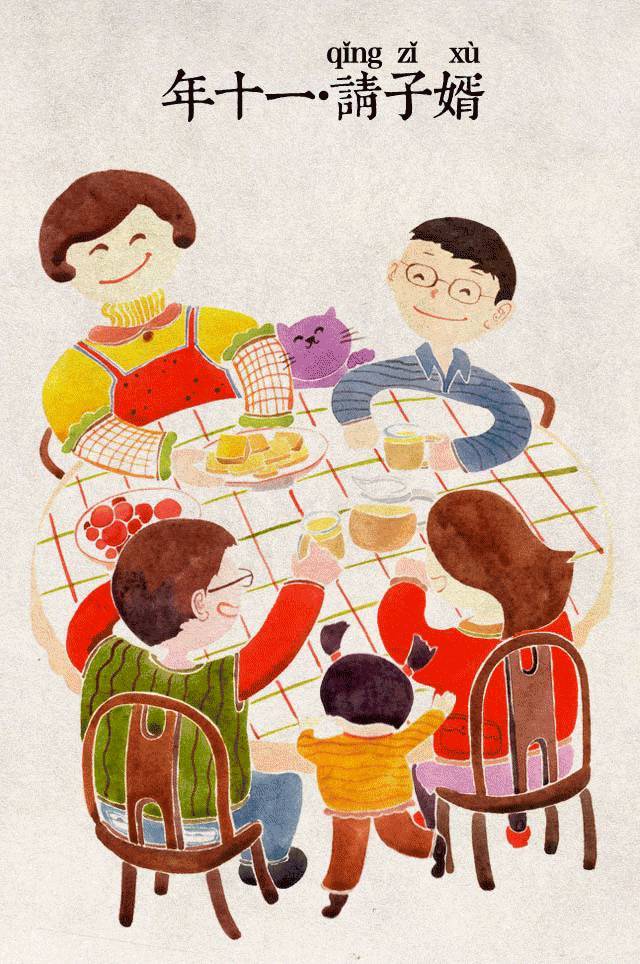 正月十一为“子婿日”,是岳父宴请女婿的日子,因为大年初二女婿全家去看望了岳父,到了正月十一,岳父也要回礼,邀请女婿来家里做客。