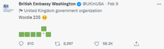 英国驻美大使馆9日在推文写道:“第235次的Wordle。”下面配上了6个绿色的字母块,其中第5块作了特别强调。2月9日当天,“Wordle”游戏的题目答案实际为英文单词“HUMOR(幽默)”,而在英式英语拼法中,“幽默”一词拼为“HUMOUR”,多出一个字母“U”。↓