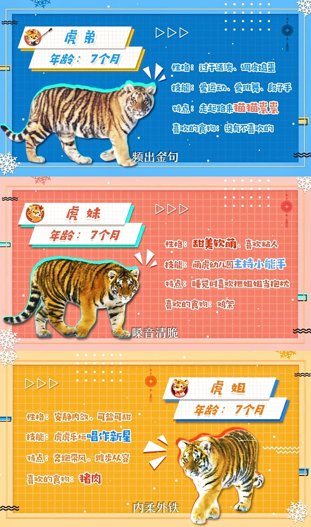 为了给这三只小家伙取一个响亮的名字,央视2022年除夕特别节目《虎跃龙腾中国年》与央广除夕特别节目《中国声音中国年》,共同发起了东北虎三胞胎全球征名活动。