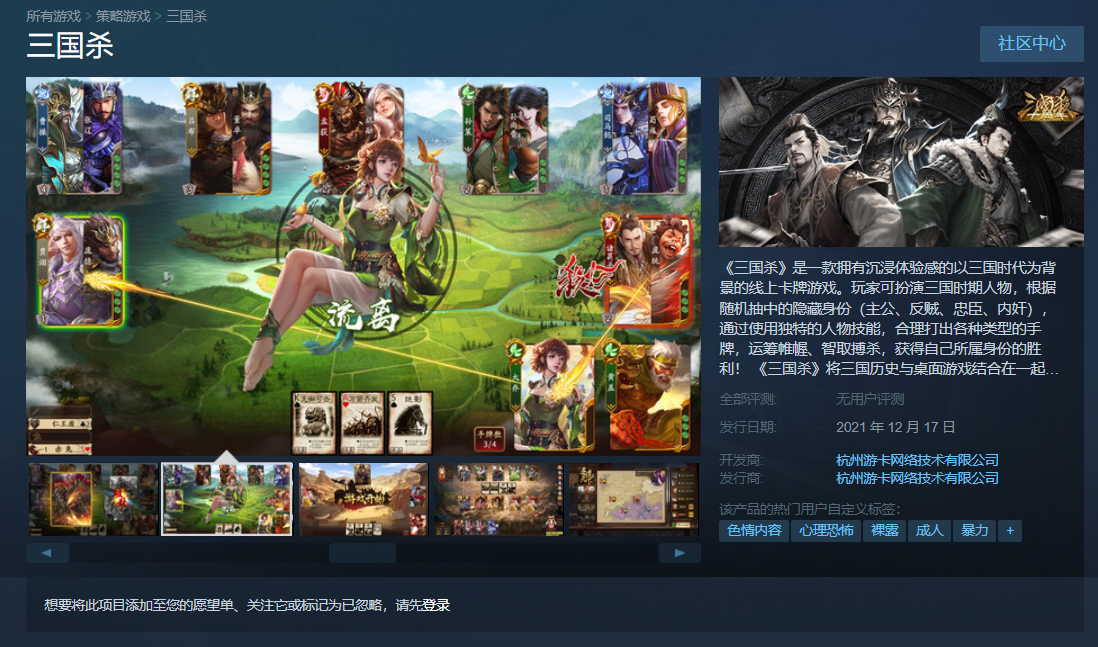 IT之家 2 月 11 日消息,由杭州游卡网络技术有限公司开发的《三国杀》游戏今日从 Steam / 蒸汽平台下架,官方未说明原因。