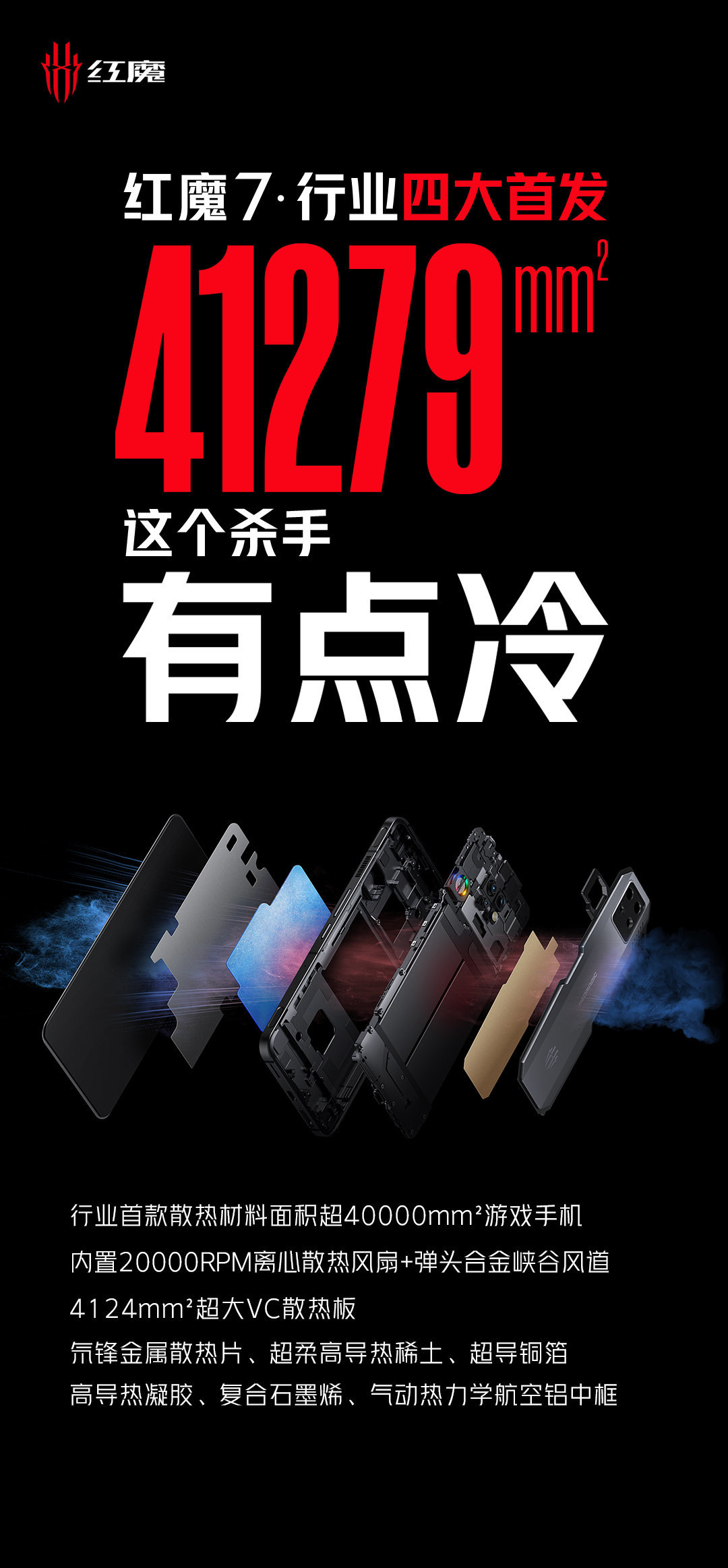 将于2月17日发布的红魔7从开始预热时就给了我们足够的惊喜,“行业四大首发”从年前就吸引了大量关注,随着发布会临近红魔也逐步给我们揭示了红魔7的更多亮点。性能最强的新骁龙8游戏手机、135W快充、红魔姬桌面互动功能和ICE魔冷散热系统等等。今日红魔再次公布了新功能点:7神装第四件“逐日之弓”——165Hz高刷屏,行业四大首发也再次揭秘了新一项——首发41279mm²的超大VC液冷散热板,产品经理姜超也上阵提前解析了红魔7的ICE魔冷散热系统。