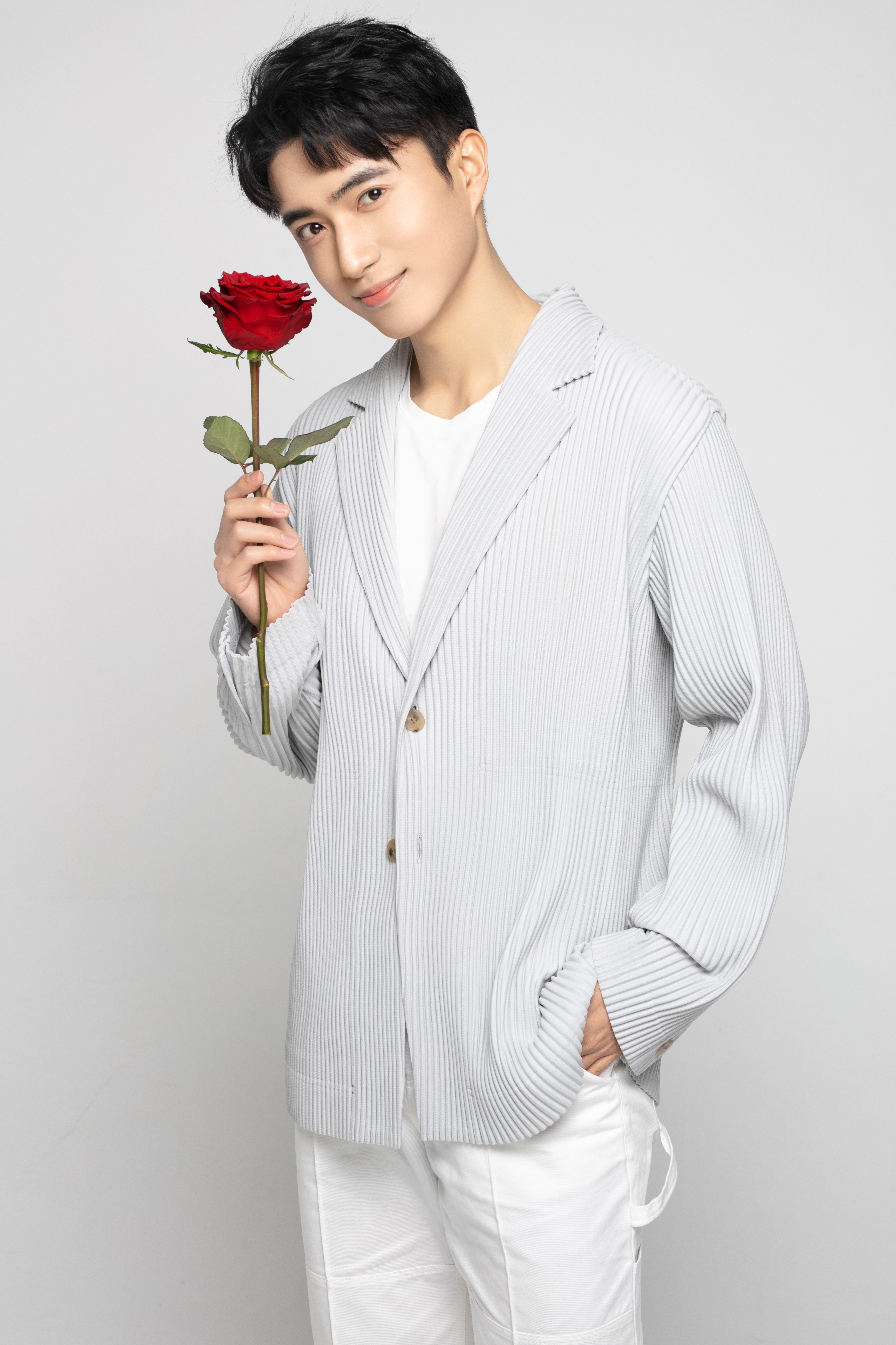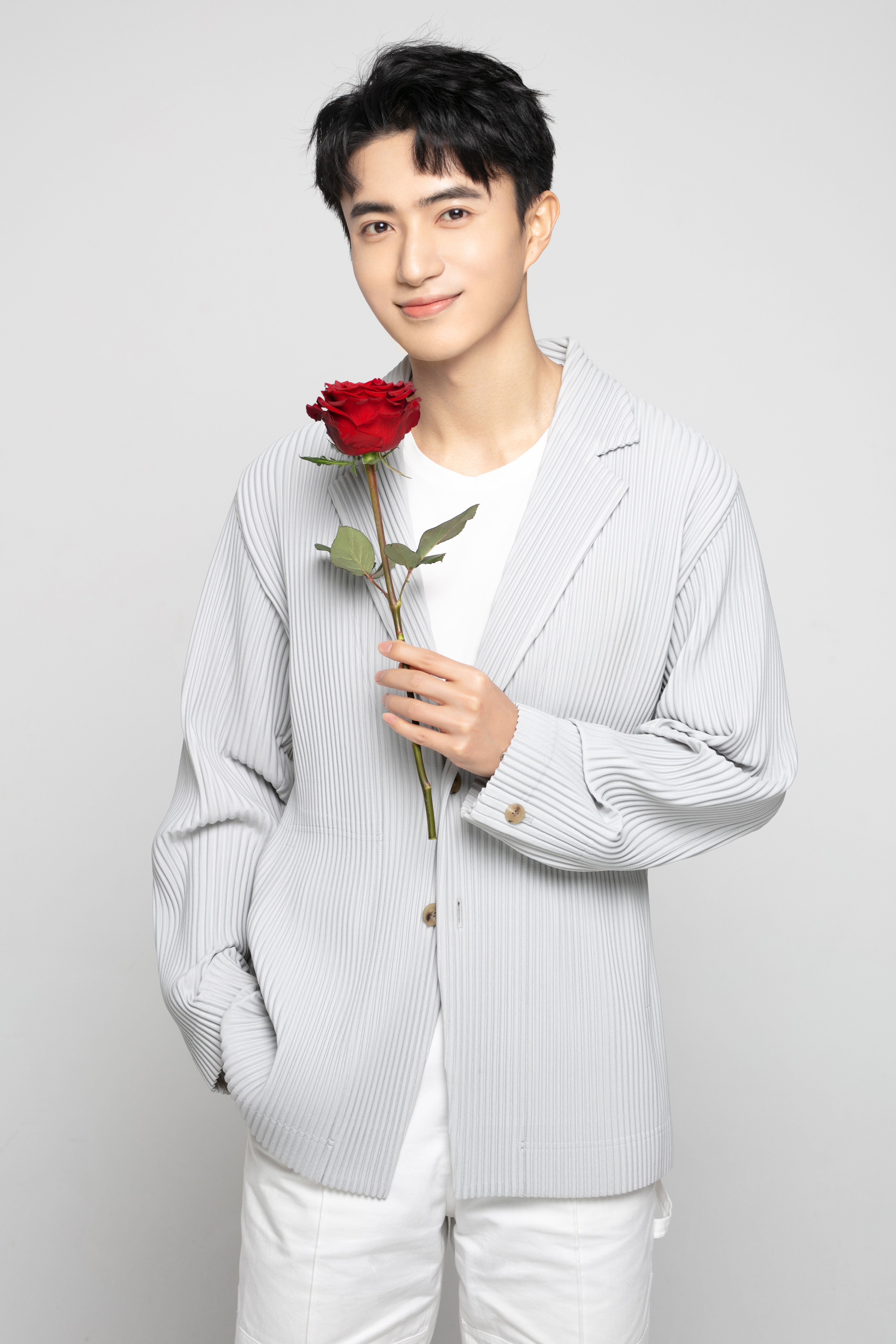 镜头下的张瑞成手持玫瑰展露温暖笑容,馥郁香气弥漫,敛眸轻嗅,雅致温柔,波纹袖口也为整体造型增添了一记巧思,浪漫气息自然流露,具有感染力的笑容让人不禁也跟着漾出微笑。