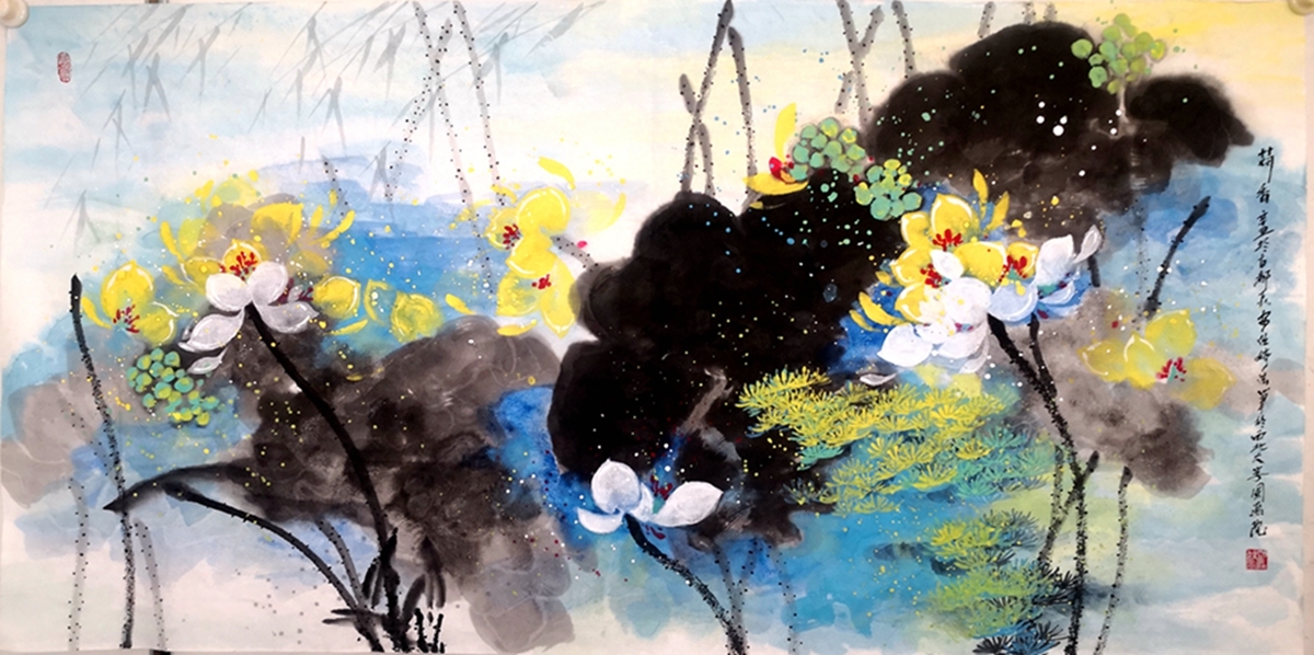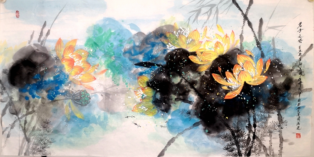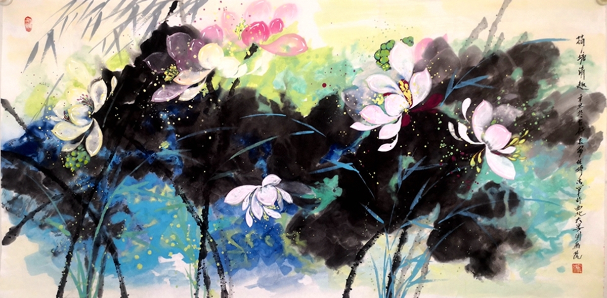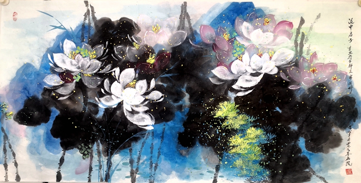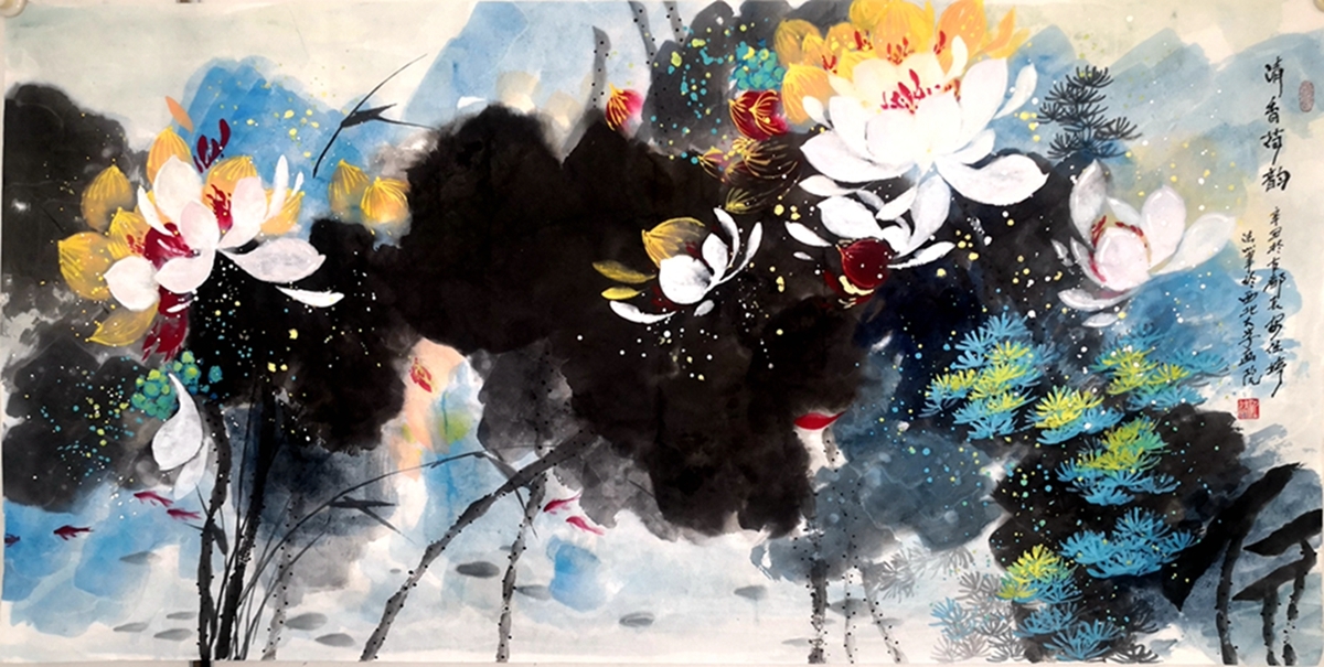 任婷自幼坚持研习国画艺术,毕业于西北师范大学。她画荷花,笔到之处狂风大作,泼彩泼墨如暴风雨过荷塘,痛快淋漓。画面上,一朵盛开的洁白荷花,其"犹抱瑟琶半遮面"的娇柔姿态,宛如一位情窦初开的少女,含情脉脉地望着这大千世界,充满着对未来幸福的憧憬……其构思缜密,运笔精巧,意境含蓄,给人一种中西合璧、大气洒脱、美不胜收的视觉冲击。