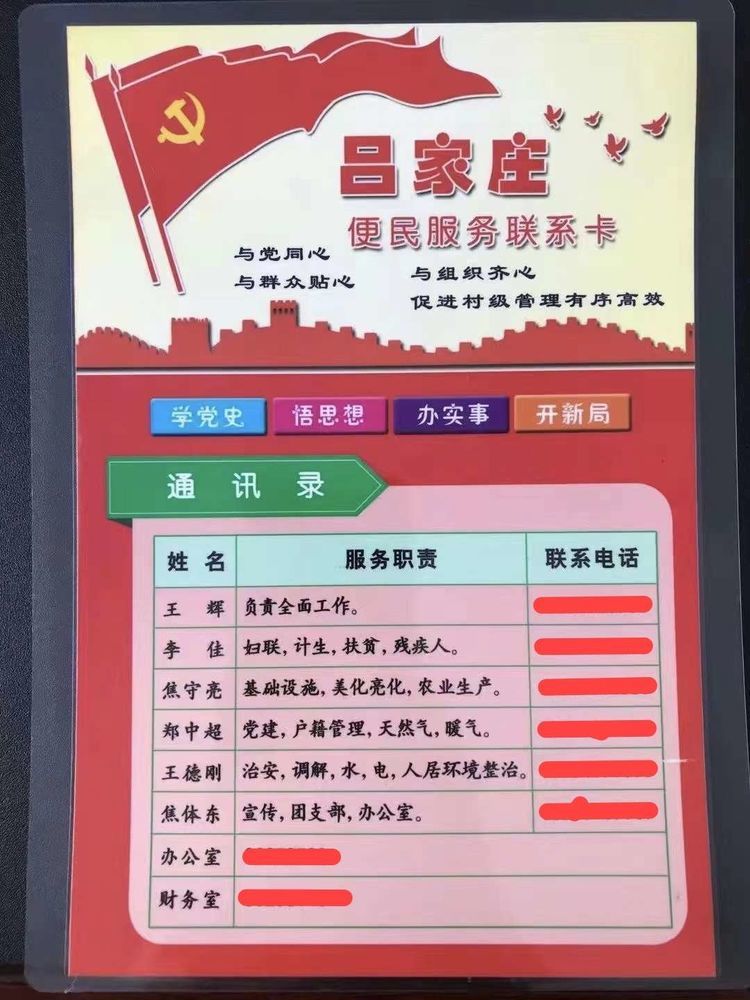 问渠那得清如许,为有源头活水来。吕家村坚持党建引领,从治理提升、堡垒筑强、队伍培育、基层保障等方面为乡村振兴提供组织保证,打造坚强有力的战斗堡垒。结合村两委换届,注重从返乡创业能力和致富带头人群体中选育村级党组织负责人,打造善谋发展、善于致富、善待百姓的乡村振兴“领头羊”。注重从退伍军人、致富能人中培养入党积极分子,增强了村级党组织活力。以开展党史学习教育为契机,加大对党员的教育培训,激发党员意识,增强党性修养,引导党员在乡村振兴中发挥先锋模范作用。聚焦群众“急难愁盼”,发放1500多份“便民服务联系卡”,小到水管漏水、换个灯泡,大到有病救助、困难帮扶,均由村里安排专人妥善解决,群众足不出户就能解决问题,群众的幸福感、获得感显著增强。同时,在便民联系服务卡印上以“三字经”形式编写的吕家村村规民约,朗朗上口,易学易记,成为吕家村自我遵守、自我约束的“小宪法”。