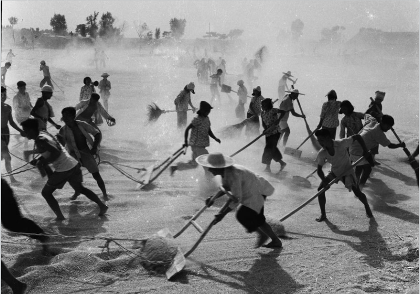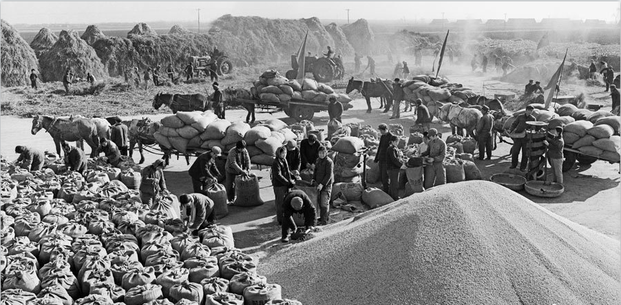 这张老照片,拍摄于1968年,拍摄地为河南某地。农业大丰收,人们正在集体广场上分装收获的粮食。远处,粮食秸秆堆成了小山一样的垛子。