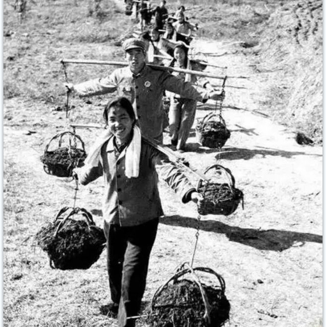 春耕时节,人们正忙着往地里农家肥,为新播种的土地施肥。这种集体劳动场面,今天看起来效率很低,但在当时也是没有办法,比较条件有限。