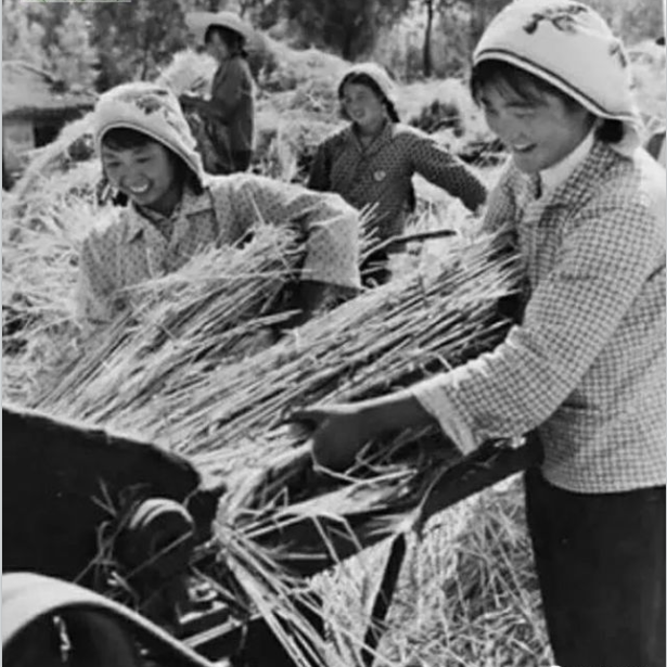 妇女能顶半边天,劳动妇女正在收割粮食。看她们脸上灿烂的笑容,就知道当年的收成有多好。