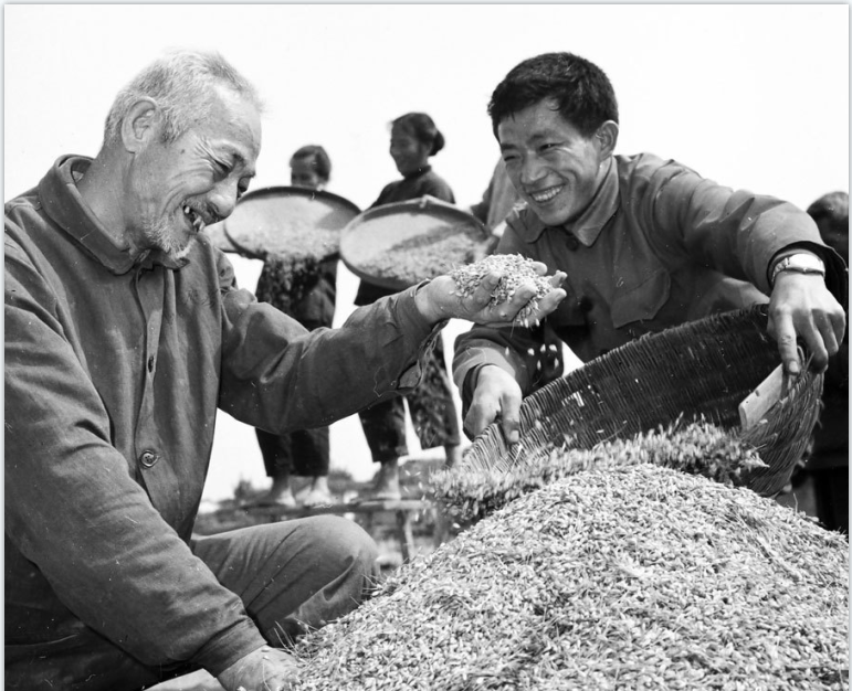 图为1976年,福建省莆田农民丰收喜悦。年仅七十的老汉,捧着手中的麦粒,笑得合不拢嘴。