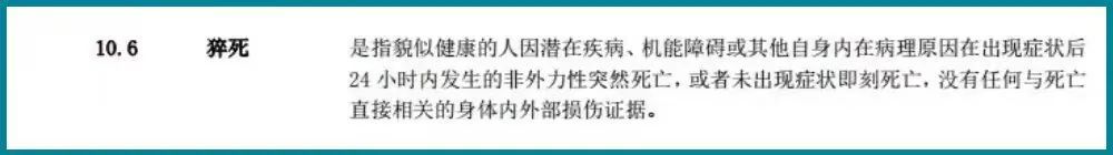 另外,它对猝死的要求也相对宽松,出现症状24小时内的死亡均可,没要求即可死亡,也没要求有医生和公安机关的证明。