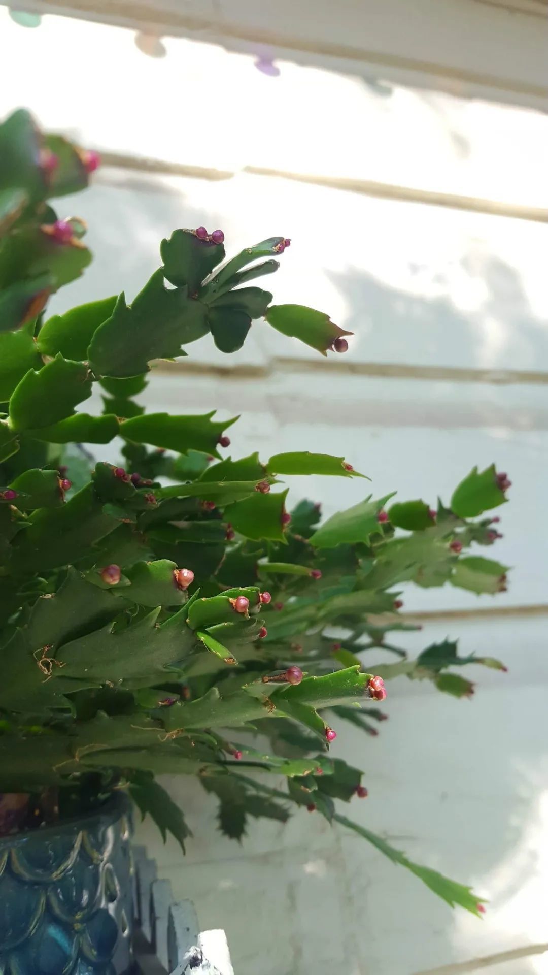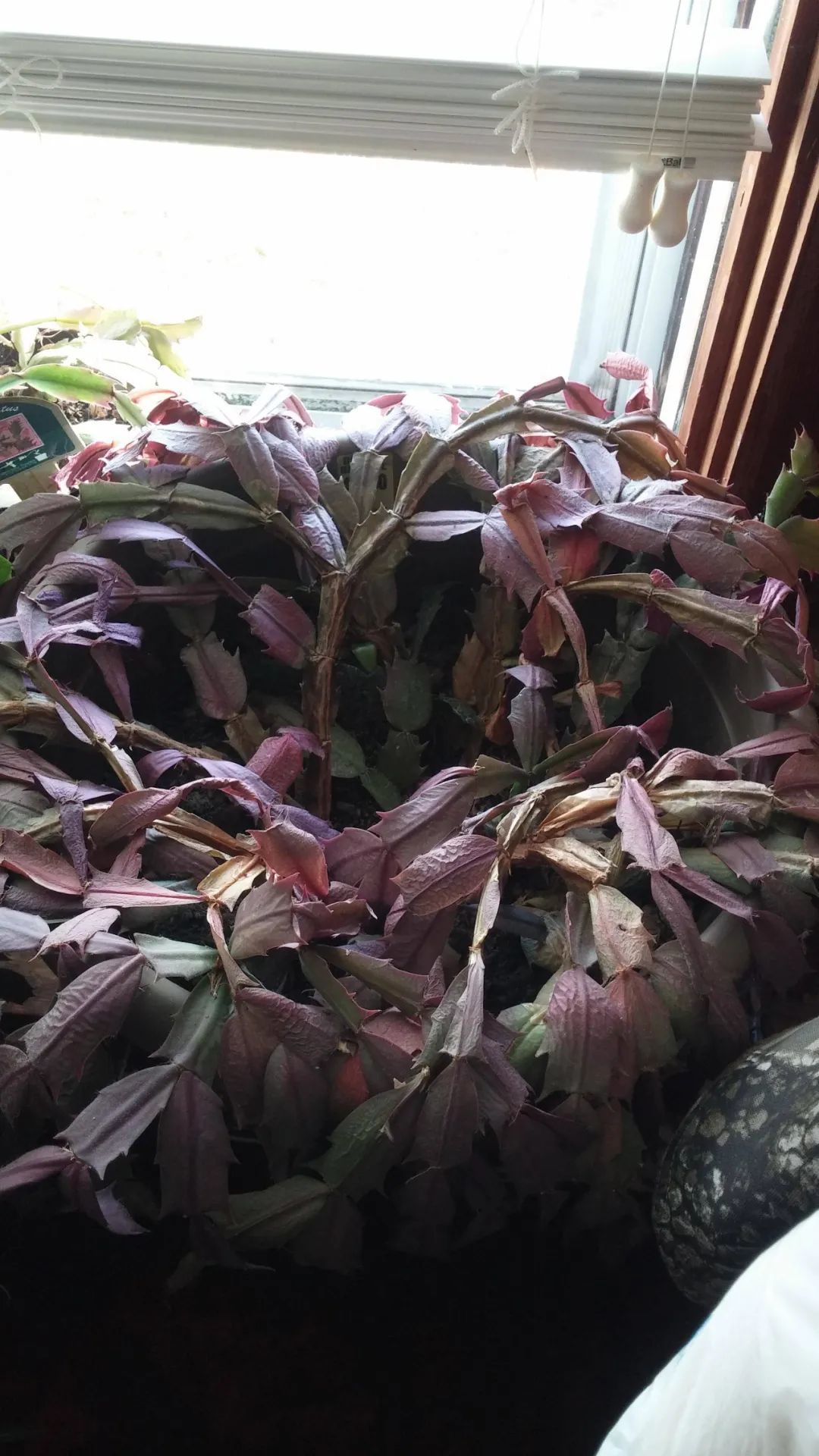 上面是过度暴晒的蟹爪兰,加上晚上温度过低,状态变差