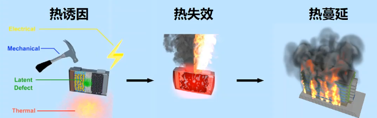 对于事故致灾机理,冯旭宁分析表示,电池安全失效过程包含热诱因-热失效-热蔓延三个阶段。电池失效有三大诱因,机械诱因、电诱因和热诱因,在三种诱因的刺激下,单节电池内部或外部发生化学反应失控及温度过高引起热失效,单节电池热失效进一步向整个系统扩展形成热蔓延。