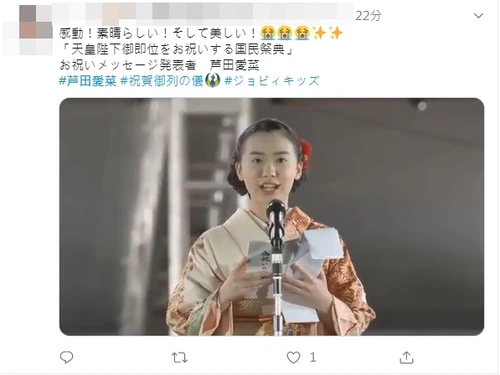 图为芦田爱菜身穿和服出席了天皇即位祭典,并作为艺人代表进行了两分钟左右的致辞,全程落落大方又是零失误,引发了民众热议,大家都对她的表现赞赏有加。
