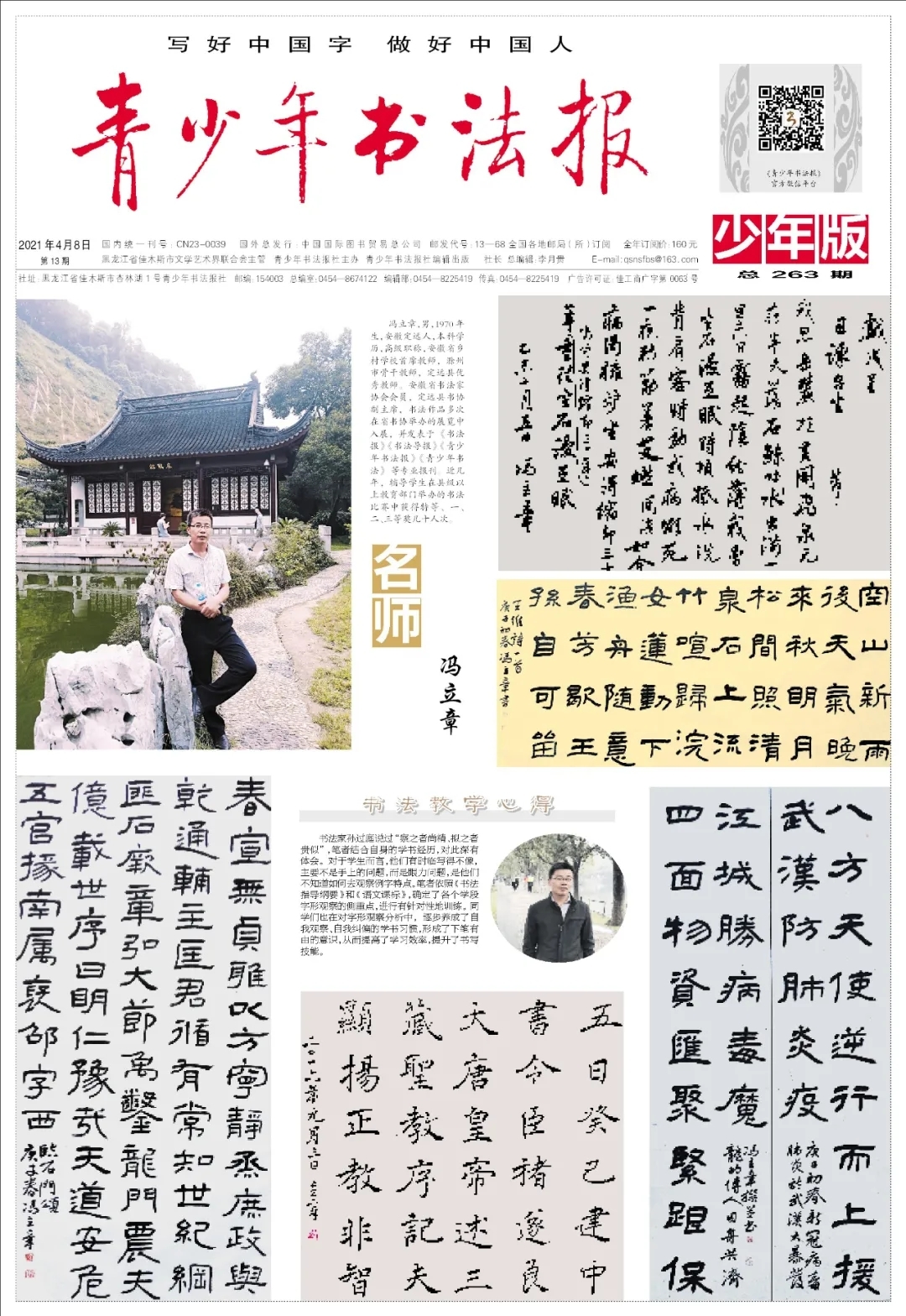 冯立章,男,1970年生,安徽定远人,本科学历,高级职称,安徽省乡村学校首席教师,滁州市骨干教师,定远县优秀教师。安徽省书法家协会会员,定远县书协副主席,书法作品多次在省书协举办的展览中入展,并发表于《书法报》《书法导报》《青少年书法报》《青少年书法》等专业报刊。近几年,辅导学生在县级以上教育部门举办的书法比赛中获得特等、一、二、三等奖几十人次。