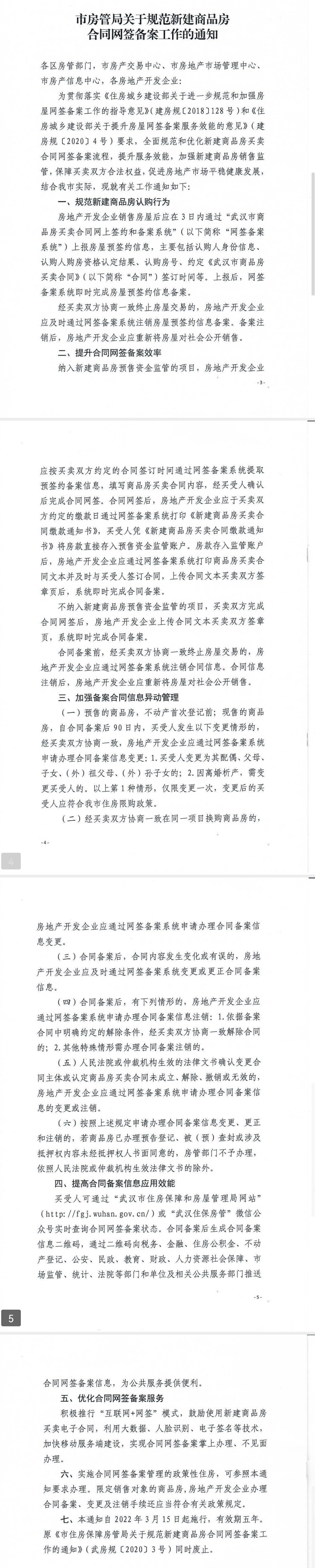 为进一步规范和优化新建商品房买卖合同网签备案流程,提升网签备案服务效能,加强商品房预售资金和合同网签备案的闭环管理,切实保护购房人合法权益,现将《市住房保障房管局关于规范新建商品房合同网签备案工作的通知》(武房规[2020]3号)部分内容予以修订,自2022年3月15日施行,有效期5年。