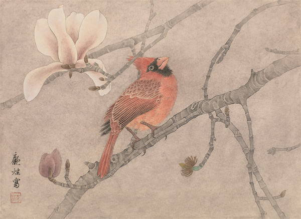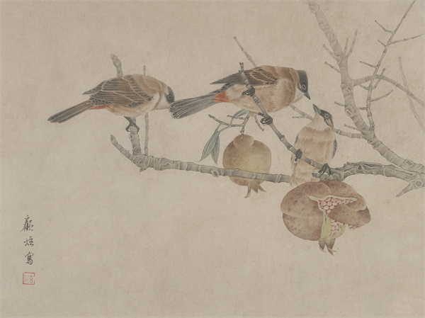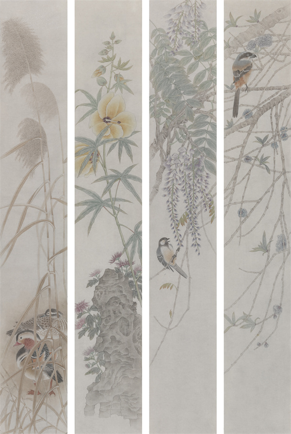 由于家学渊源,顾炫的工笔画特别注重写生和勾线的训练。在写生同时也采集一些植物标本,如枯莲蓬、荷叶、落花、枯枝等,零落在各个可见的角落。他更潜心研究花鸟的季节、品类、生长规律、文化品格,积稿数以千计。在花卉中,他喜欢萧瑟的芦苇、疏枝、残荷,也喜欢清新蓬勃的桃花与梨花。或苍凉蕴藉或饱满明艳,都是他所欣赏的,一如他丰富性情的两面。