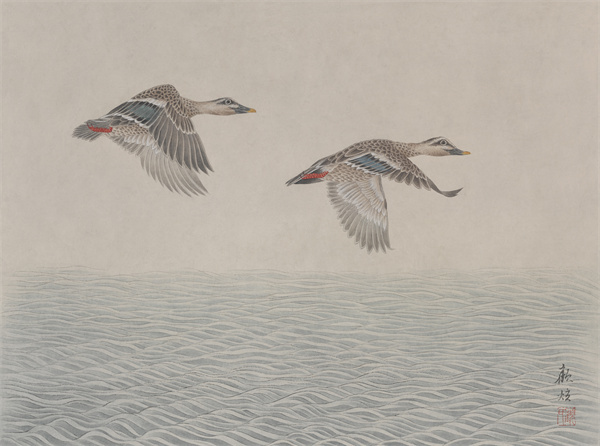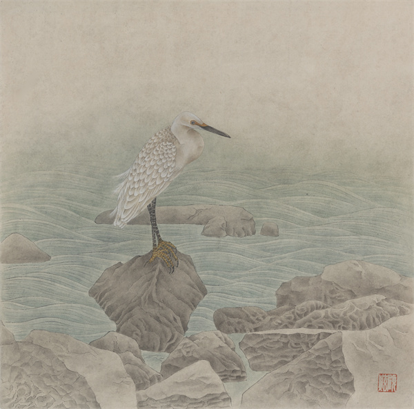 日深月久的写生与创作,顾炫入画的禽鸟有鹌鹑、白头翁、八哥、苍鹭、鹦鹉、珍珠雀、绿头鸭、伯劳、麻雀、翠鸟、鹡鸰、山雀等,有些将飞将翔在宋画里,而鹈鹕、朱鹮、反嘴鹬、火烈鸟等外来物种是古人不曾描绘的,顾炫也一一纳入画面,从而扩大了传统工笔花鸟题材的表现范围。他的禽鸟,有概念化的夸张变形,也有对真实造型的多角度深入发掘,包含着人与自然,人与天地精神相往来的思考与实践。他尝试打破传统花鸟画惯有的构图模式,早期的花鸟画往往有高山远水的背景,有景深,有穿插,场面阔大,铺陈繁茂。近几年来,顾炫更留意褶皱、烘染、肌理的意外效果以及笔墨变化,将简化或异化了的背景的块面与线条构成,投入茫茫一片灰色调中。无边清寂之中,忽觉鸟兽禽鱼自来亲人,一片自在天地之相,呈现出颇有意味与格调的现代性与形式感。