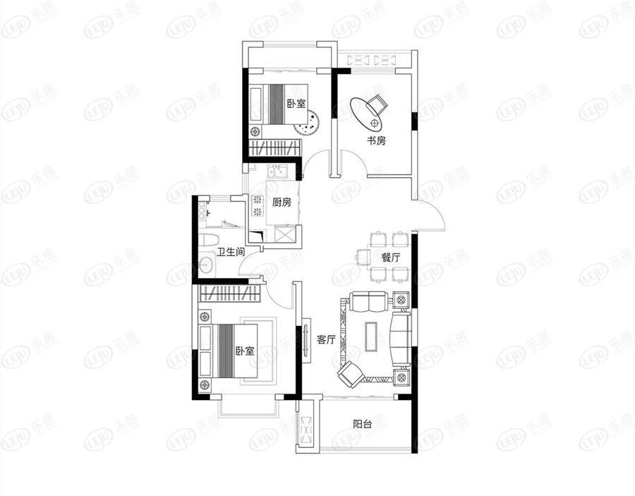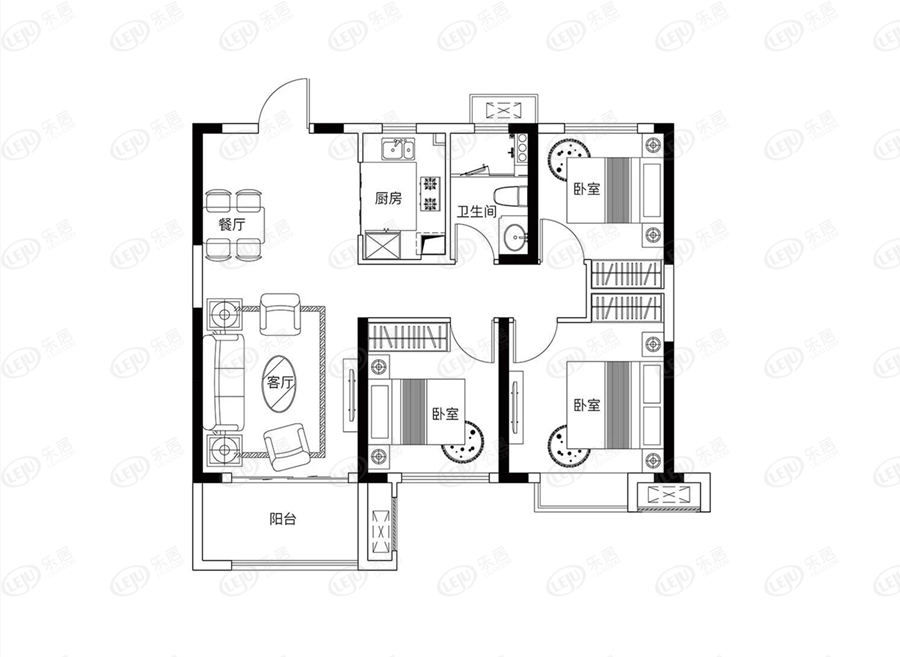 客厅面宽挺大,厨房设计成开放式,视野更开阔。93-96平的三房,新婚等刚需家庭完全够用,唯一不足就是卫生间仅有一个,稍有不便。