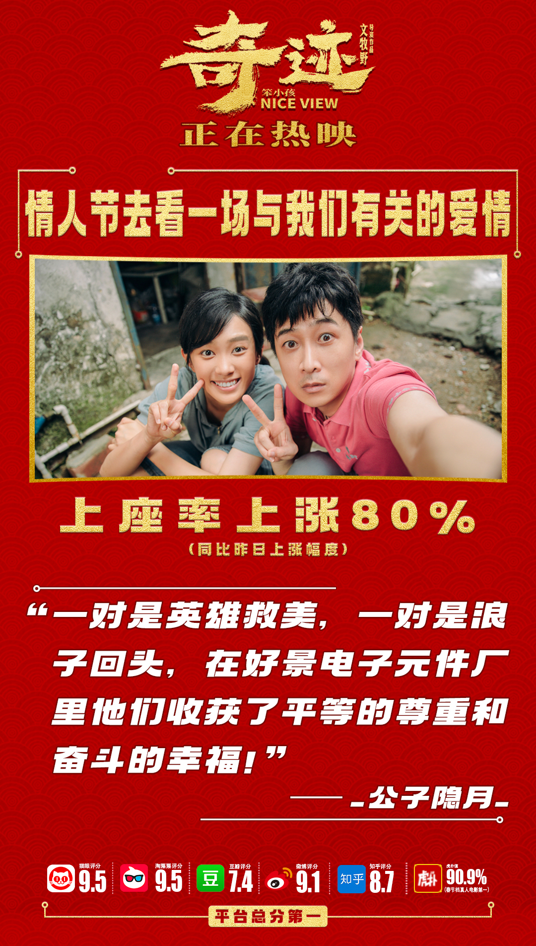 《奇迹·笨小孩》展示了爱的多样性,情人节不止有爱情,它可以是景浩和妈妈之间的家人挚爱,也可以是景浩与“奇迹小队”之间的团结友爱,更可以是影片中每个人对于追逐幸福生活的理想之爱。而在映后互动环节,更有女性观众现场喊话男友“虽然我不像吴晓丽会开挖掘机,但你能放弃游戏么!”、“看完《奇迹·笨小孩》择偶标准都提高了,景浩的勤奋,梁叔的暖心,张超的幽默,刘恒志的浪子回头,我都很欣赏”。