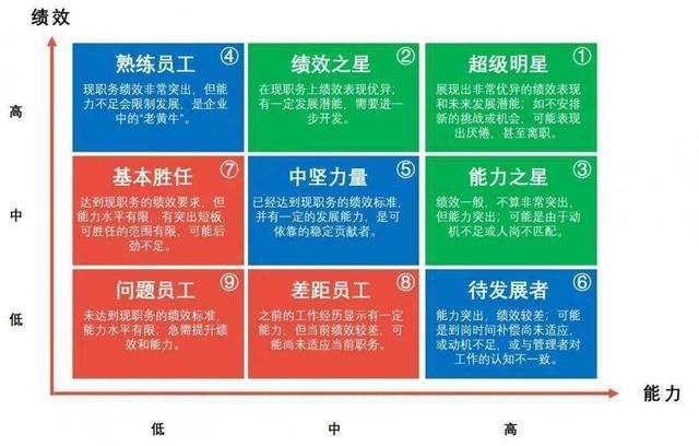 在人才盘点时,根据人才的绩效和能力(包括潜力),分别作为纵坐标和横坐标,将人才盘点的结果划分为9个象限,人才分为九个类别,以便于分类管理,因材施教。