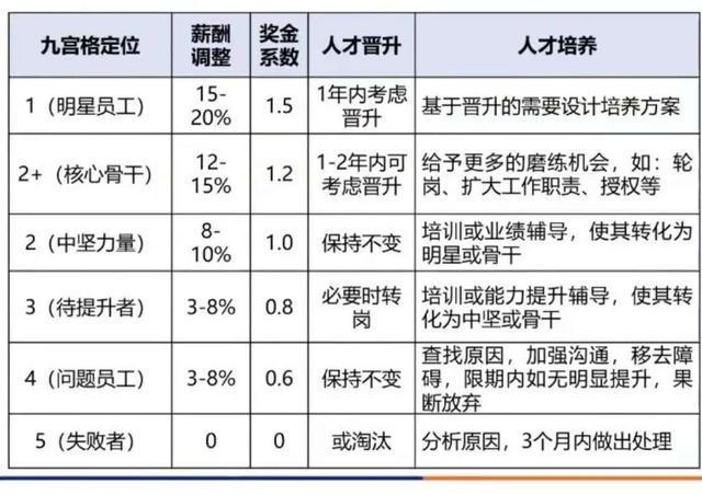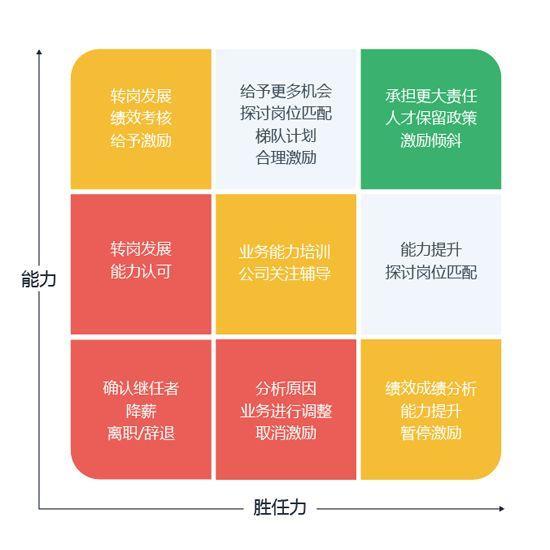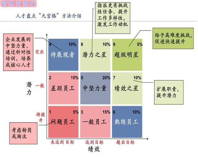 人才管理,基于组织的人力规划和盘点,将现有人才分门别类的放入以上9个象限,将人才分为9个类别。根据各类别的特点,不同问题不同,给予针对性的处理策略。