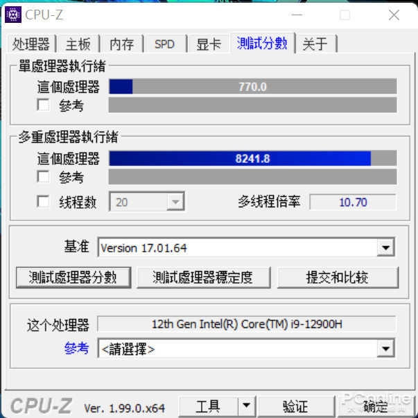 同样的,在CPU-Z经典的V17测试中,表现出了良好的性能,8241.8的高分已经超越了上一代桌面级i9-11900K。