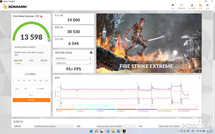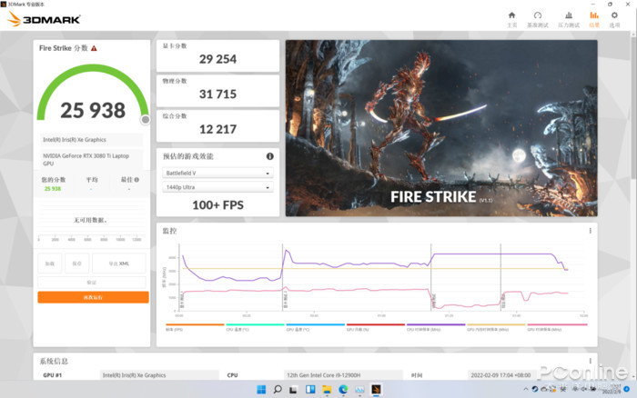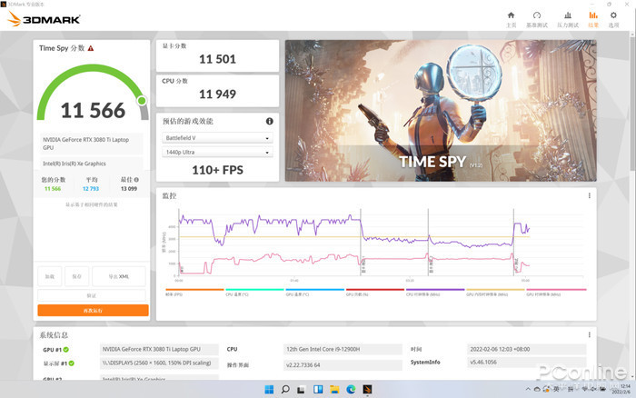 通过3DMark的Fire Strike模式来看,总分为25938分,Fire Strike Extreme总分13598分,Time Spy的总分为11566分。这都彰显着这块RTX3080Ti显卡的性能强大。
