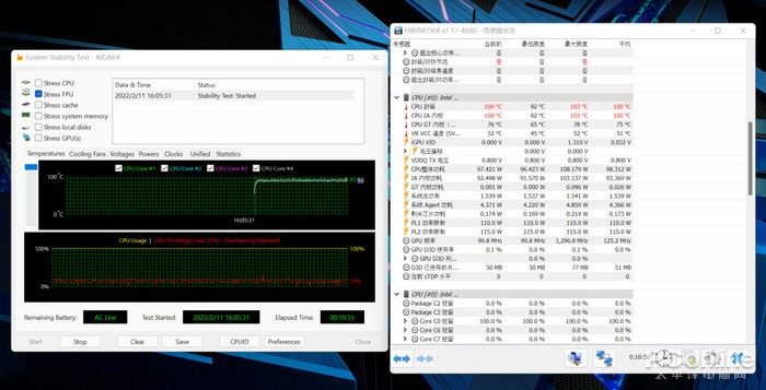 使用AIDA64 FPU+FurMark进行双烤15分钟,CPU功耗保持在30W左右,GPU功耗则在95W上下,性能释放相对保守。