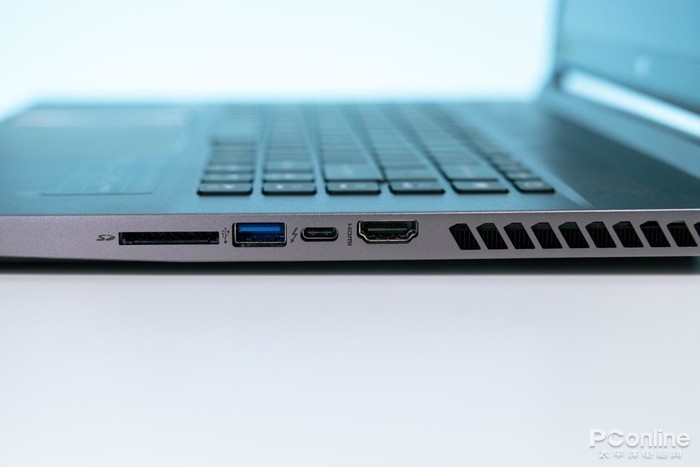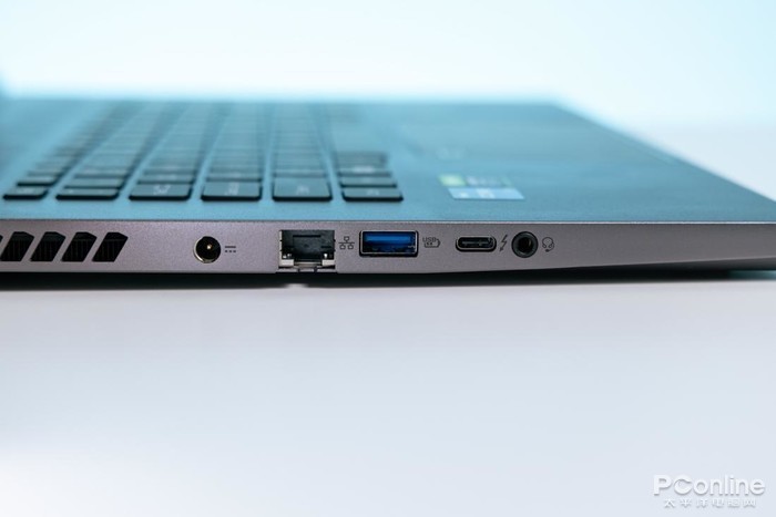接口方面,机身左侧依次为电源接口、RJ45网线接口、USB 3.2 Type-A接口、雷电四接口、耳机耳麦二合一接口;机身右侧依次为HDMI 2.1接口、雷电四接口、USB 3.2 Type-A接口、SD读卡器。