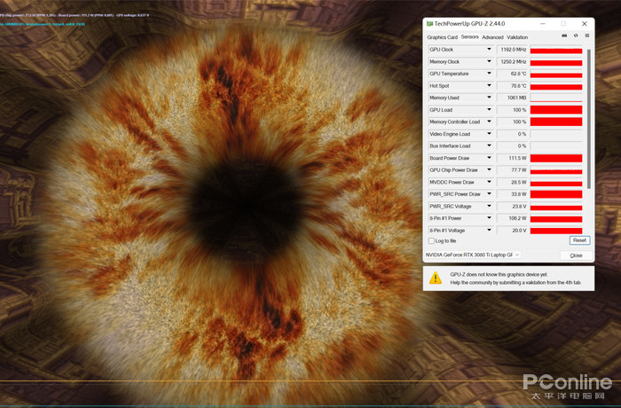 单烤Furmark,显卡功耗111.5W,温度66℃,频率1192MHz。