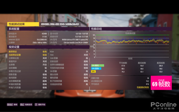 在官方提供的性能测试中,可以达到平均69FPS的综合帧数,流畅玩耍这款赛车游戏完全没有问题。