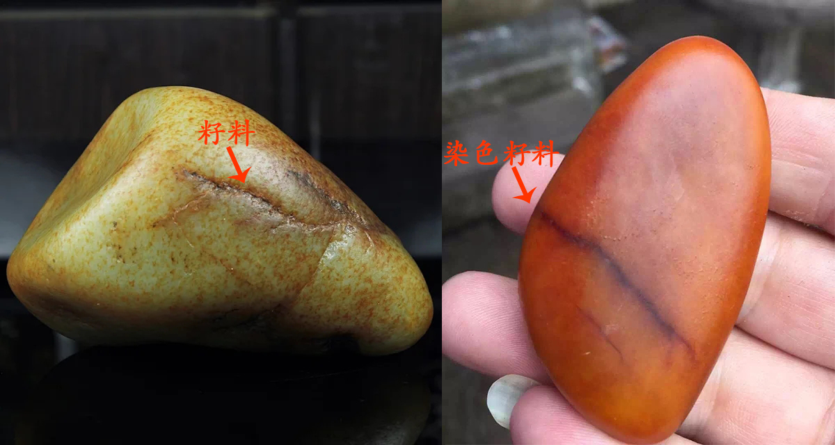 在籽料里裂还可以作为真假籽料的辨别方式,通常在裂口处沁色是比较深的,由裂口处向肉质内部渐变。如果是假籽料,颜色堆积在裂口处,没有向内部延伸。与周围色差很明显。