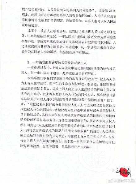 首先,上诉书称,江歌妈妈起诉刘鑫的一审程序中遗漏了必要的共同原告,即江歌的父亲,因而属于程序违法。张公典分析认为,本案受害人江歌已离世,根据《最高人民法院关于审理人身损害赔偿案件适用法律若干问题的解释》第一条“本条所称赔偿权利人,是指因侵权行为或者其他致害原因直接遭受人身损害的受害人、依法由受害人承担扶养义务的被扶养人以及死亡受害人的近亲属”的规定,江歌的父亲和江歌妈妈作为江歌的近亲属,均有权对刘鑫提起诉讼。同时,二人均享有独立的诉讼地位,即使江歌父亲未作为共同原告,也不影响江歌妈妈的独立诉讼地位。江歌妈妈仍有权单独对刘鑫提起诉讼,故一审法院在此并不存在程序违法情形。