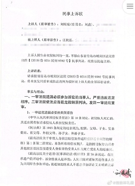2月16日,江歌母亲诉刘暖曦(曾用名刘鑫)案将在山东省青岛市中级人民法院二审开庭。在这之前,网络上相关人士公布了刘鑫的二审上诉书。该上诉书对一审判决提出了多点质疑。其中第一条便认为一审法院遗漏了必须参加诉讼的当事人,严重违反法定程序,二审法院依法应当裁定撤销判决,发回一审法院重审。
