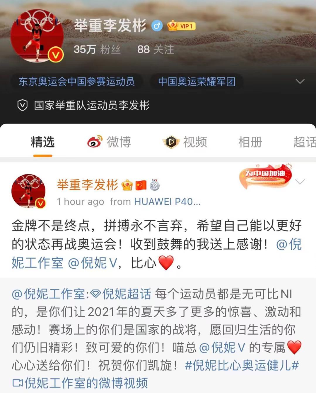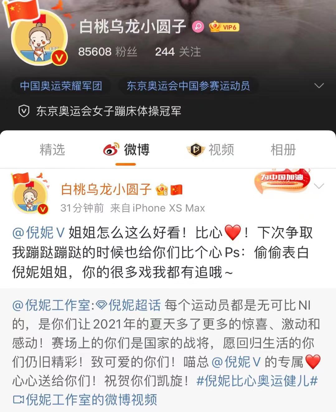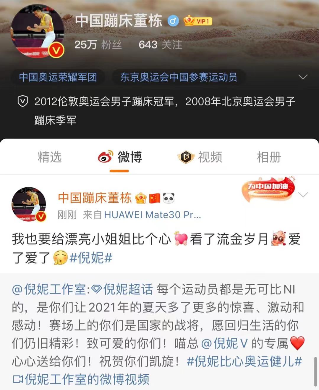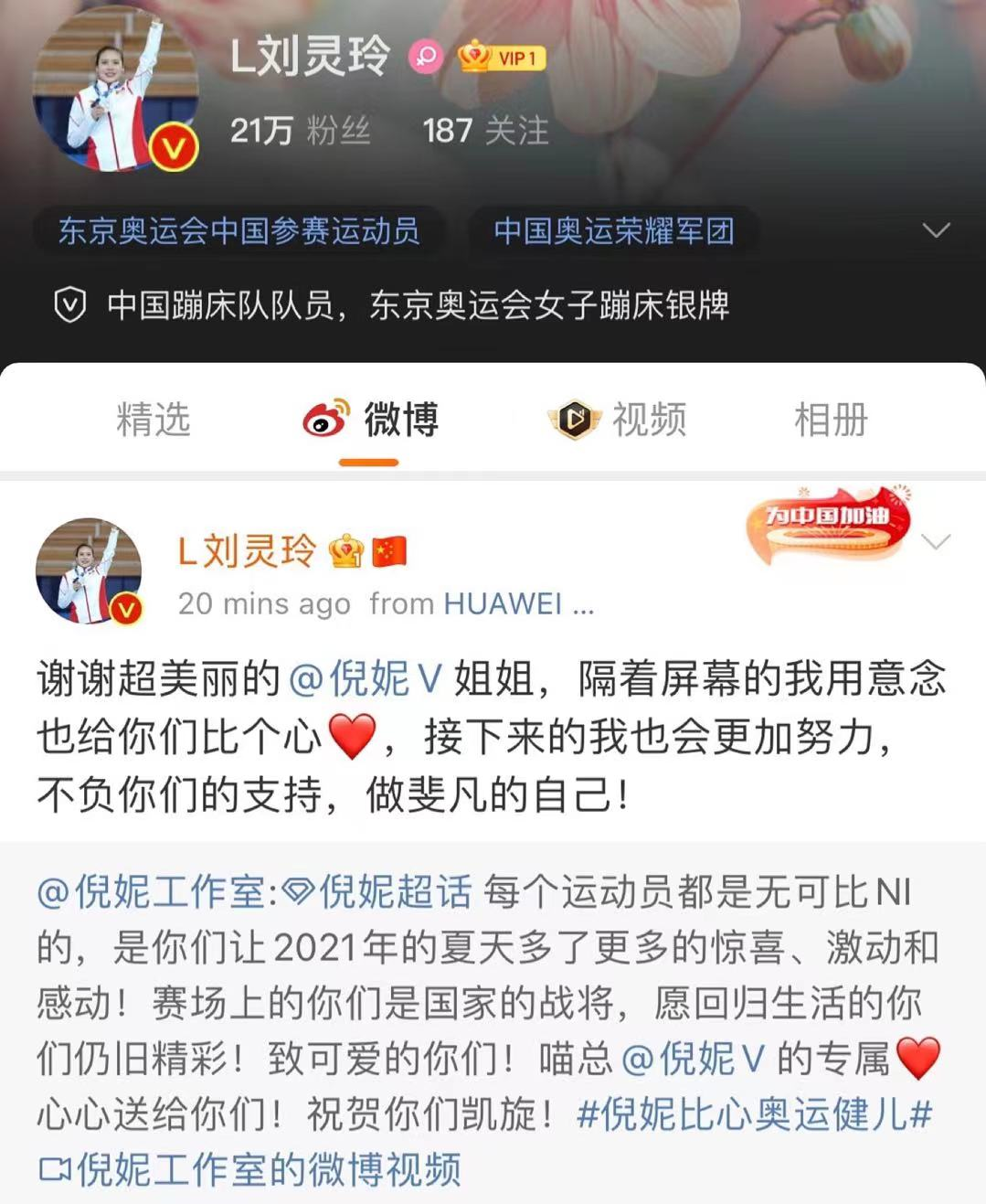 随着奥运会接近尾声,我国奥运健儿夺冠归来,为了向奥运健儿致敬,今天倪妮在微博晒出爱心视频,与奥运健儿朱雪莹、刘灵玲、赵帅、李发彬隔空互动,