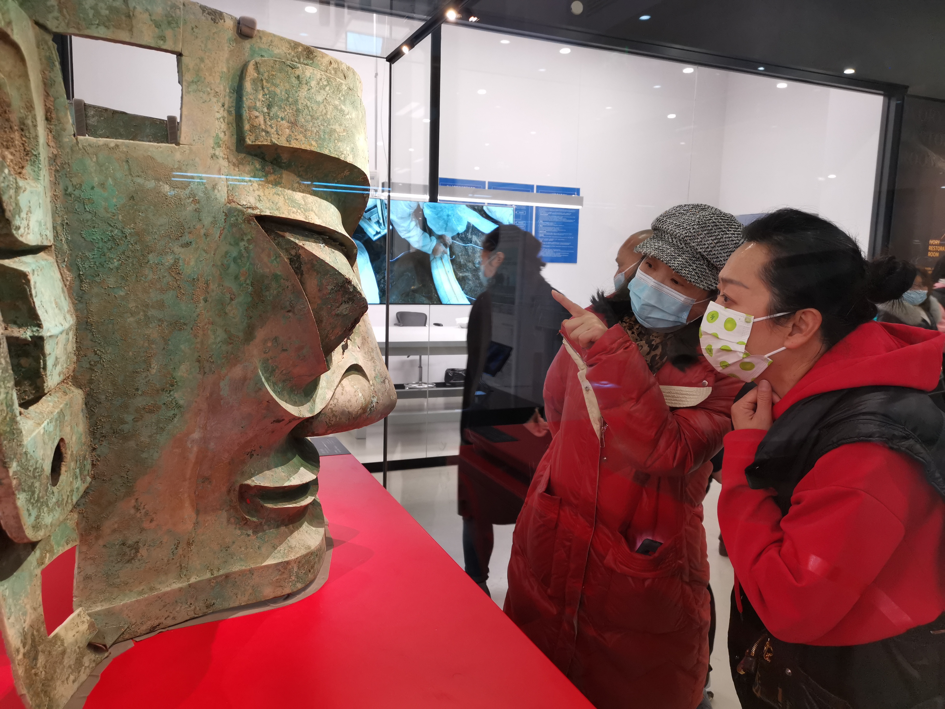 三星堆青铜大面具15日在四川省广汉市的三星堆博物馆临时展出,让前来参观的游客“先睹为快”。