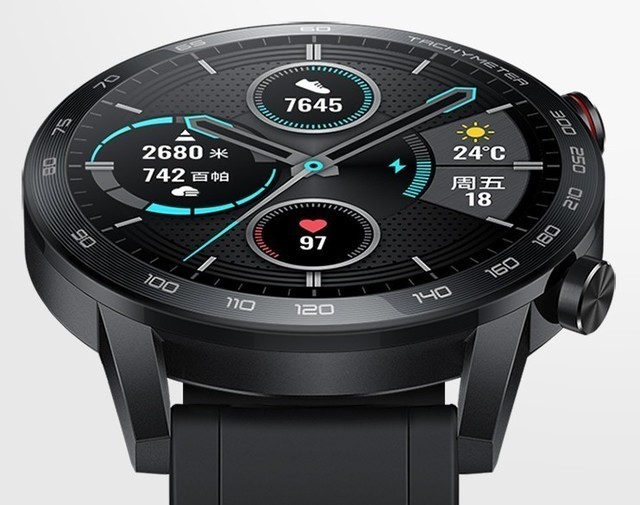 Honor MagicWatch 2 拥有运动款碳石黑和时尚版亚麻棕两种配色,拥有运动手表外观,46mm版表盘为1.39英寸AMOLOED材质圆屏,碳石黑表体材质为金属+塑胶,亚麻棕版本表带为牛皮,典型工作时间14天。