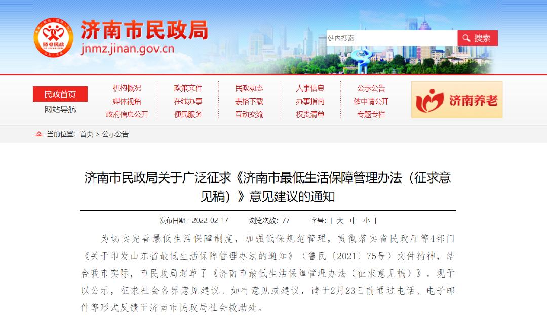 为切实完善最低生活保障制度,加强低保规范管理,贯彻落实省民政厅等4部门《关于印发山东省最低生活保障管理办法的通知》(鲁民〔2021〕75号)文件精神,结合我市实际,市民政局起草了《济南市最低生活保障管理办法(征求意见稿)》。现予以公示,征求社会各界意见建议。如有意见或建议,请于2月23日前通过电话、电子邮件等形式反馈至济南市民政局社会救助处。