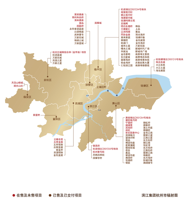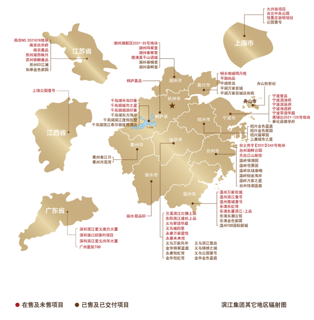在浙江,滨江完成对全省11个地级市的全覆盖。此外,滨江更在兰溪、东阳、天台等地频频出击,省内市场正呈现从一二线城市往三四线县城的下沉全布局。除杭州外,滨江集团2022年在浙江省内在售/待售项目达31个之多。