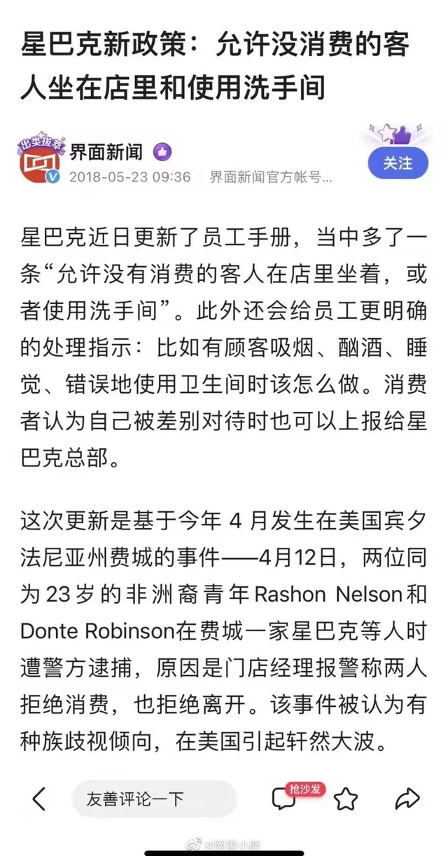 因这件事星巴克更新了员工手册,当中多了一条“允许没有消费的客人在店里坐着,或者使用洗手间”。
