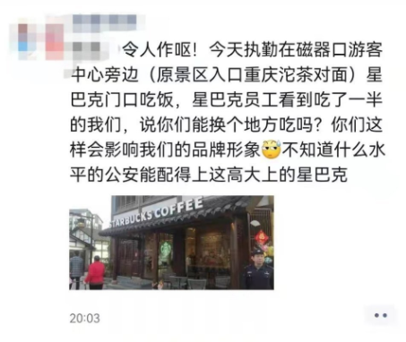 而2022年重庆星巴克,四位人民警察于星巴克门口外吃盒饭,以“影响品牌形象”被要求离开,其后被投诉。