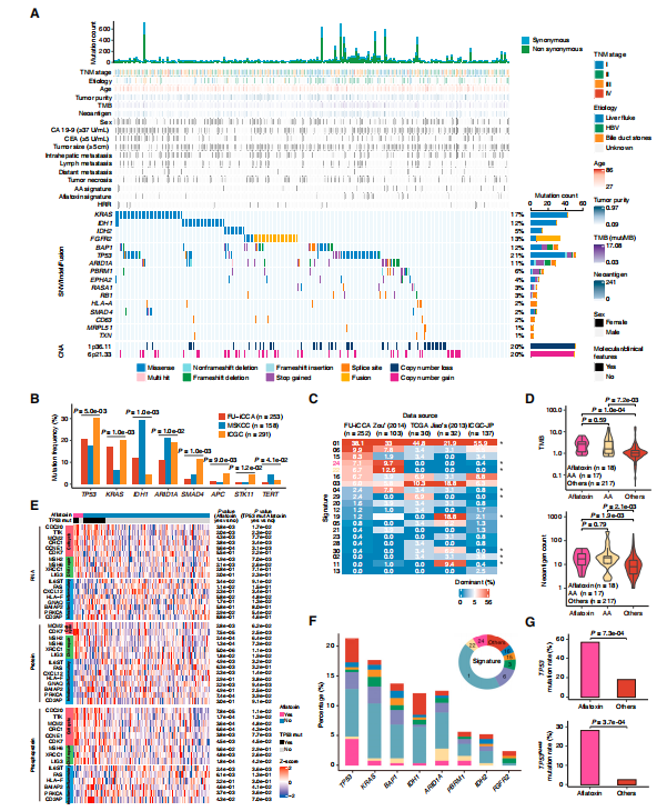 为了描述中国iCCA患者的蛋白质基因组特征,作者收集了262个来自前瞻性队列的未接受治疗的iCCA患者肿瘤和配对癌旁组织(FU-iCCA)。共鉴定了12,197个非同义体细胞点突变和603个插入缺失。蛋白质组定量到了10,529种蛋白质,磷酸化蛋白质组定量到了来自9,832个磷酸化蛋白的62,879个磷酸化位点。基因组确定了包括TP53、KRAS、FGFR2、IDH1/2、BAP1、ARID1A和PBRM1在内的16个显著改变的肿瘤驱动基因(图1A)。与西方iCCA人群队列相比,本文队列显示出更高的KRAS突变频率和更低的IDH1、ARID1A和TERT突变频率(图1B)。在FU-iCCA队列中观察到黄曲霉毒素和马兜铃酸特征(图1C)。通过比较具有或不具有黄曲霉毒素特征的所有肿瘤的多组学数据,发现具有黄曲霉毒素特征的肿瘤显示出DNA修复和细胞周期通路的上调以及细胞凋亡、感染炎症和免疫通路的下调(图1E)。进一步分析显示,TP53突变与黄曲霉毒素特征显著相关(图1F和1G)。