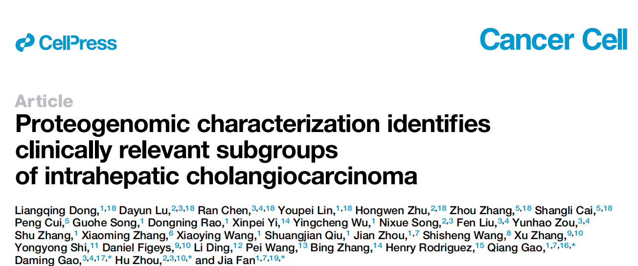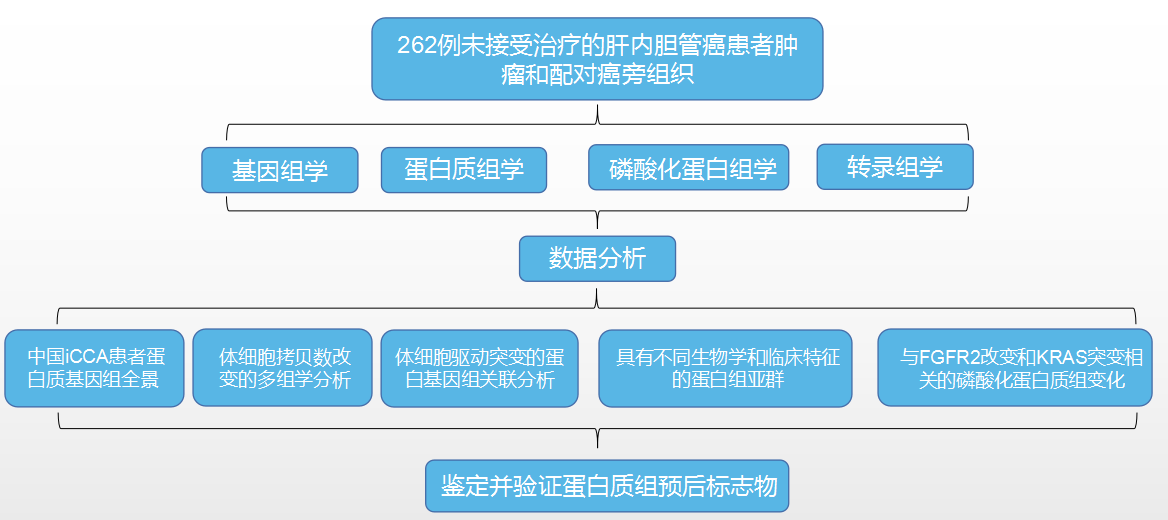 肝内胆管癌(iCCA)是常见的原发性肝脏恶性肿瘤。多数患者发现时已是晚期,且治疗效果有限。因此迫切需要更深入地了解肝内胆管癌的发病机制以鉴定可能的治疗靶点。本文在国际癌症蛋白质基因组联盟(ICPC)的主持下,对262名中国iCCA患者进行了基因组学、转录组学、蛋白质组学、磷酸化蛋白质组学等分析,为进一步的生理病理研究、疾病诊断和药物研发提供基础数据。