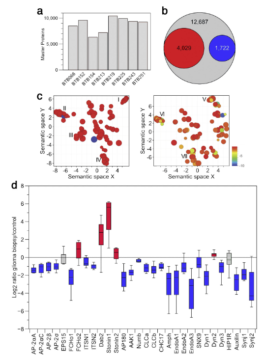 文章中提到共鉴定出12687个蛋白,其中4029个蛋白质上调,1722个蛋白质下调。挑选2倍倍数变化的差异表达蛋白做功能分析。从下调蛋白质的生物学分类中,研究集中在非常紧密的簇VI上,该簇被注释为“clathrin-结合簇”(图1c)。 对于该簇中存在的蛋白质,计算了单个胶质瘤活检组织和对照组之间的Log2转化率。结果显示,在细胞膜上,参与CCV和CIE载体产生的各个阶段的内吞机制成分显著减少,包括引发剂、主要和替代结构性涂层成分、涂层相关激酶、膜曲率传感器和弯曲器,以及与运输载体的断裂和脱膜有关的因素(图 1d)。具有明确表型的CCV生产中的关键参与者是AP-2,clathrin和dynamin。除了dynamin 2(与dynamin1和3相比,在脑组织中仅少量表达),所有这些成分均显示出蛋白量至少减少了2倍。在分析中,受影响最严重的蛋白是EndoA1-3(图1d)。EndoA1-3是经典CME机制的一部分,目前研究表明其也参与了CIE途径,特别是FEME途径。由于动态蛋白水平降低(CME和多条CIE途径依赖于此),胶质瘤可能在细胞内吞过程中受到损害。