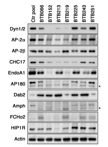 为了验证蛋白质组学数据,通过免疫印迹分析了内吞作用不同阶段的一些代表性成分(图2)。AP-2复合物的两个亚单位,这是CME发生和发展的核心成分。主要的脑特异性α-适应素(αA)免疫印迹产生的信号与蛋白质组数据相似,在BTB152、213和219中的表达特别低(图2)。β-亚单位的减少也可以观察到。参与TGN向内皮细胞内转运的AP-1复合物的β1,由于现有的抗体对AP-2的β2不是特异性的,因此其明显较低。AP180在大多数活检中也明显缺失。与蛋白质组数据一致,免疫印迹进一步证明了clathrin重链(CHC17)的大幅减少。CME和大多数CIE新生载流子的分裂是由动力学驱动的。用抗dynamin 1/2的抗体检测胶质瘤匀显示出剧烈下调(图2)。