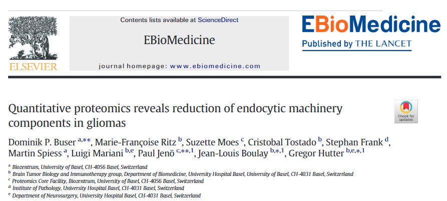 [2] Buser DP, et.al,. Quantitative proteomics reveals reduction of endocytic machinery components in gliomas. EBioMedicine. 2019 Aug;46:32-41. doi: 10.1016/j.ebiom.2019.07.039. Epub 2019 Jul 19. PMID: 31331834; PMCID: PMC6711119.