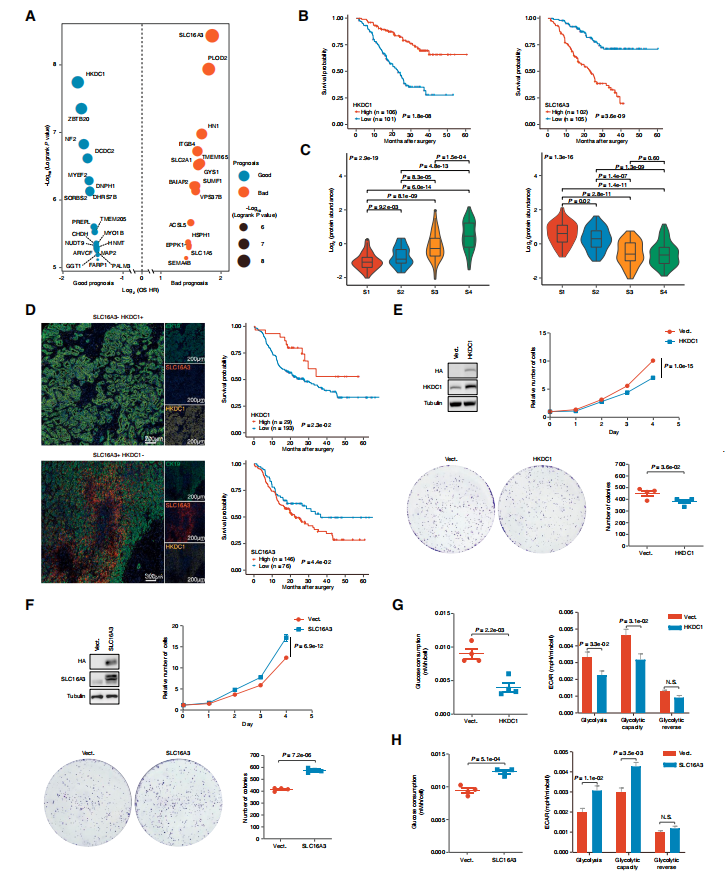 作者通过监督分析鉴定了19种良好预后相关蛋白质和15种不良预后相关蛋白质(图3A)。其中,HKDC1是最显著的预后正相关蛋白,SLC16A3是最显著的预后负相关蛋白(图3B)。这两种蛋白的丰度在四个蛋白质组亚型中也存在显著差异,SLC16A3在S1中上调,HKDC1在S4中升高(图3C)。在另一个独立的iCCA队列(图3D,n = 222)中,免疫染色结果表明HKDC1低表达和SLC16A3的高表达预示着不良预后,进一步确认了其预后价值。本文数据表明HKDC1可能在iCCA中充当肿瘤抑制因子。实验发现HKDC1的过表达降低了HuCCT1细胞的细胞增殖、集落形成、葡萄糖消耗和糖酵解能力,支持其在iCCA细胞中的抗糖酵解/增殖作用(图3E、3G)。而过表达SLC16A3的HuCCT1细胞表现出更快的增殖和更高的集落形成(图3F),这可能是由于更有效的糖酵解能力(图3H)。SLC16A3敲低显著降低了HuCCT1细胞增殖、集落形成和糖酵解能力。因此,SLC16A3主要通过促进糖酵解代谢在iCCA中发挥致癌因子的作用。