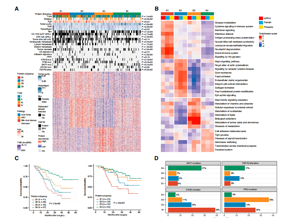 作者使用变化最大的1,376种蛋白质进行聚类(图2A),鉴定了4个不同的蛋白质组亚型(S1-S4),这些亚型具有不同的临床、基因组、免疫学和微环境特征。S1展现出丰富的炎症蛋白表现,例如CD14、MPO和C5AR1。S2具有最高水平的癌症相关成纤维细胞和ECM相关的蛋白质,包括FAP、POSTN和FLT1。S3的特点是MAPK和代谢蛋白升高,例如ACAT1、FASN和IDH1。S4保留了粘附和胆道特异性蛋白的最大表达,例如ANXA4、KRT18和EPCAM(图2B)。